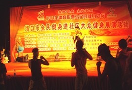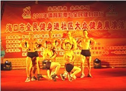 8月7日,由海口市文化广电出版体育局主办,海口市健美协会、海口旅游景区物业管理有限公司承办,海南省体育彩票管理中心、海南省青少年事业发展中心协办的“海口市全民健身进社区大众健身展演”活动在白沙门生态公园阳光草坪成功举办,来自时尚健身俱乐部、维纳斯健身俱乐部等11家健身场馆参加了展演。活动展示包括瑜伽、男子健美、钢管舞、搏击操等精选体育健身项目,活动还穿插了“趣味力量举”、“幸运抽奖”等观众互动节目,现场人山人海、欢声笑语、热闹非凡。