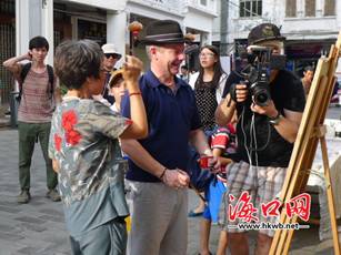 20日下午,大型纪录片类节目《遇见海南人》第一站来到海口中山路骑楼老街,来自英国的著名旅游电视节目主持人伊恩·莱特在此邂逅炭画世家传人韩翠琼老人,两人一拍即合。韩老太亲手传授伊恩·莱特中国传统的毛笔字,并现场为他演绎神奇的炭画艺术,伊恩·莱特看完后对韩老太赞不绝口。