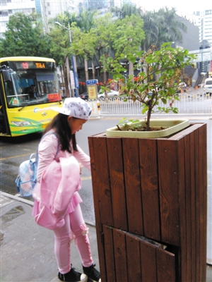在国贸路上,记者看到桶顶戴“花冠”,配有木制“护身符”的垃圾桶。