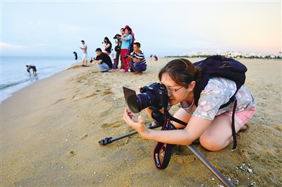 6月4日傍晚,海口白沙门海边聚集了众多摄影师、发烧友,他们架起长枪短炮像狙击手一样站着、趴着、跪着,在沙滩上拍摄夕阳美景。入夏以来,海口天气变幻莫测,火烧云、彩虹、落日等气象景观轮番上演,给摄影爱好者提供了绝佳的拍摄时机。 南国都市报记者 陈卫东 摄