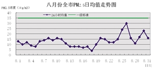 8月份全市环境空气质量达到国家《环境空气质量标准》(GB3095-2012)一级标准30天,二级标准1天。全市二氧化硫(SO2)、二氧化氮(NO2)、可吸入颗粒物(PM10)和细颗粒物(PM2.5)平均浓度分别为5μg/m3、18μg/m3、29μg/m3和13μg/m3。一氧化碳(CO)日均值第95百分位数是0.6mg/m3;臭氧(O3)日最大8小时滑动平均值的第90百分位数是84μg/m3。