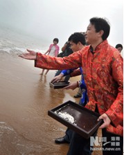 当日上午十时,海口假日海滩中心广场上热闹非凡。书写着“祭海”大字的9米高狼牙祭旗威武肃穆,66面幡旗迎风招展,百人锣鼓队尽显声势。随着鸣炮、息鼓,庄严的祭海大典开始。祭海大典仪式上,主祭燃香拜礼、主祭及陪祭人员拜礼后,现场所有的市民与游客都向南海各神三鞠躬拜礼。最后,主祭官将祭品投入海中。一场祭海大典让海口市民和游客感受了古老海祭的神秘和庄严,亲身体验了博大宽广的海洋民俗文化。
