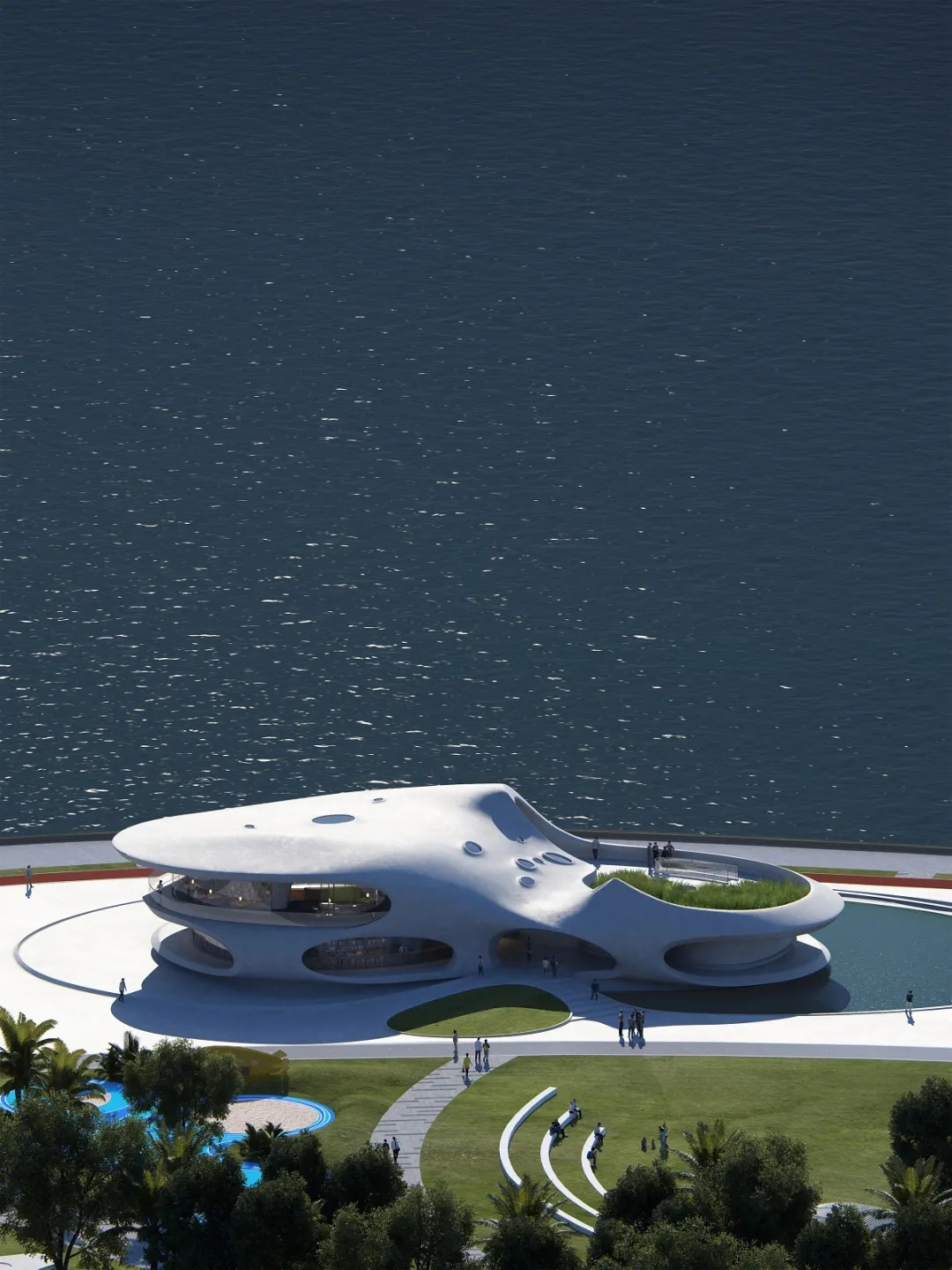 建筑由白色混凝土一体浇筑成形,内外合一,形成多个半室外空间和平台。卷曲的混凝土墙体,既是有机形态的建筑结构,也是连接不同空间的纽带,墙,地,天花融成一体。大大小小的孔洞是有机的呼吸口,也将自然光线引入空间的深处。