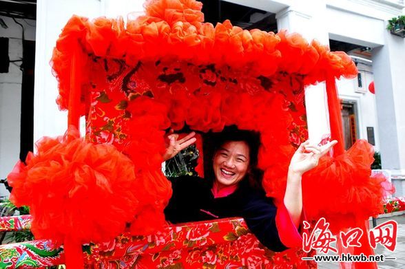 现代人成家立业结个婚大多数都选择轿车来迎接新娘,可是中国古代抬花轿迎新娘的传统作法至今仍受市民喜爱,看看这位大姐坐上海口老街的花轿好开心,她说几十年前我就是这样走出娘家的!