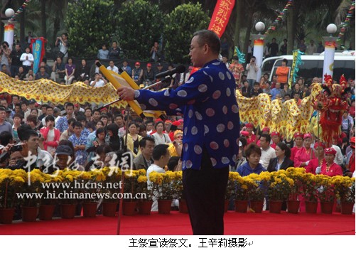 重头戏祭海大典展示的是海南人民对大海的敬仰与爱护,现场9米高的狼牙祭旗威武肃穆,66面幡旗在海风中招展,百人锣鼓队威震海疆。10时整,祭海大典开始,主祭宣读祭文,现场气氛热烈,最后主祭官收集十供入瓶封装,上船到固定地点投入海中,祭海活动至此全部结束。据介绍,这一活动今后将每年举办。