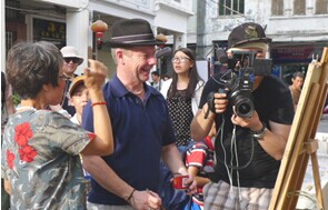 《遇见海南人》摄制组的拍摄第一站是海口中山路骑楼老街。20日下午,拍摄伊恩·莱特在此邂逅炭画世家传人韩翠琼老人,韩老太亲手传授伊恩·莱特中国传统的毛笔字,并现场为他演绎神奇的炭画艺术,伊恩·莱特看完后对韩老太赞不绝口。