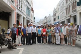 位海外华文媒体高层人士走进海口中山路骑楼老街,宾客们惊叹南洋风情的骑楼美景,表示将通过华文媒体向世界更好地宣传推介海南和海口。