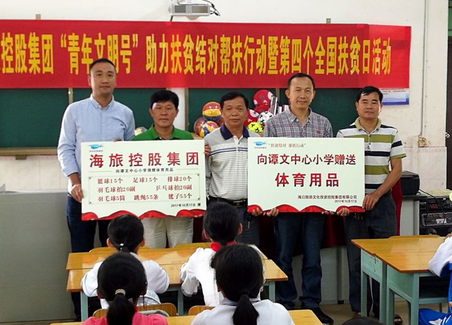 2017年10 月17 日是我国第四个扶贫日,按照《海口市 2017 年扶贫日活动方案》的工作要求,以实际行动向党的“十九大”献礼,当天上午,海旅控股集团在结对帮扶村清泉村委会和谭文中心小学分别组织开展包含扶贫日宣传、入户走访贫困户、两家贫困户保障房装修开工、扶贫攻坚专题座谈和“青年文明号”扶助捐赠等“扶贫日”系列主题活动。集团党委书记、董事长杨晓峰,党委副书记、纪委书记秦有军,副总经理林天蒂、集团团委书记张亲波以及相关人员共计14人参加活动。