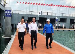 在听取公共码头的项目概况、规划设计、赛事活动情况以及海口市西海岸现代化海洋牧场项目的规划情况后,考察组一行沿浮码头实地参观公共码头建设情况。