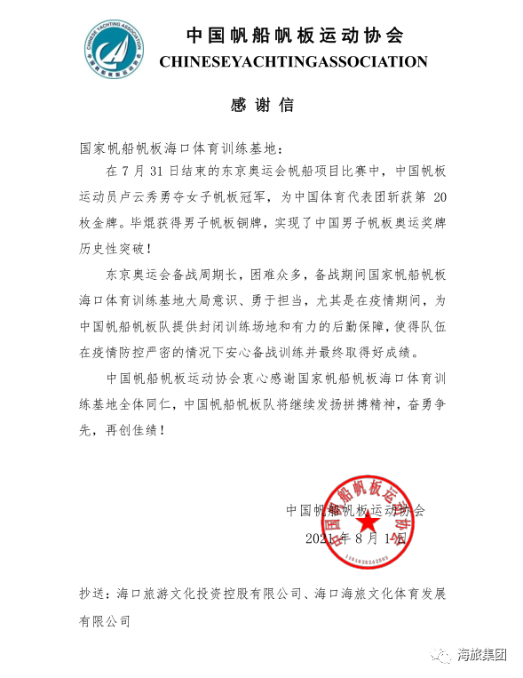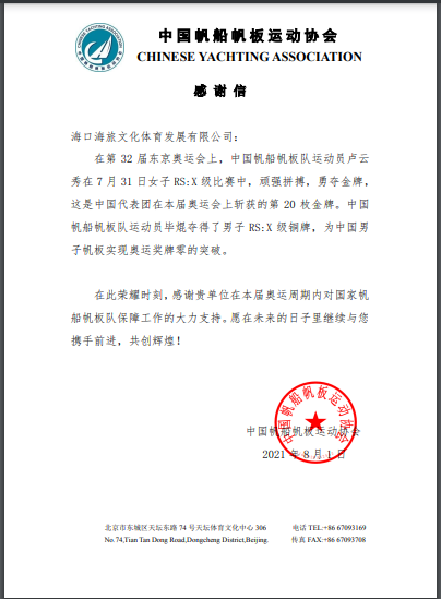 2021年8月1日,中国帆船帆板运动协会向我司发来《感谢信》,并表示:“在此荣耀时刻,感谢贵单位在本届奥运周期内对国家帆船帆板队保障工作的大力支持。愿在未来的日子里继续与您 携手前进,共创辉煌!”